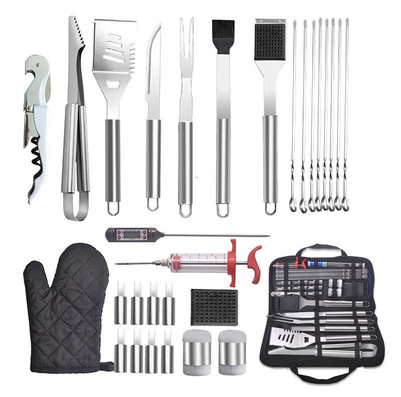 It’s the ULTIMATE BBQ KIT! 30 pieces in all – made of high-quality, sturdy, dishwasher safe, stainless steel and secured in a zipper enclosed canvas carrying case. Special design features such as built-in metal hanging loops on each tool, 8-8.5-inch handles on each tool, and 3 different edges on the spatula for the ease of cutting and tenderizing with one tool. You’ll never need another BBQ set again!