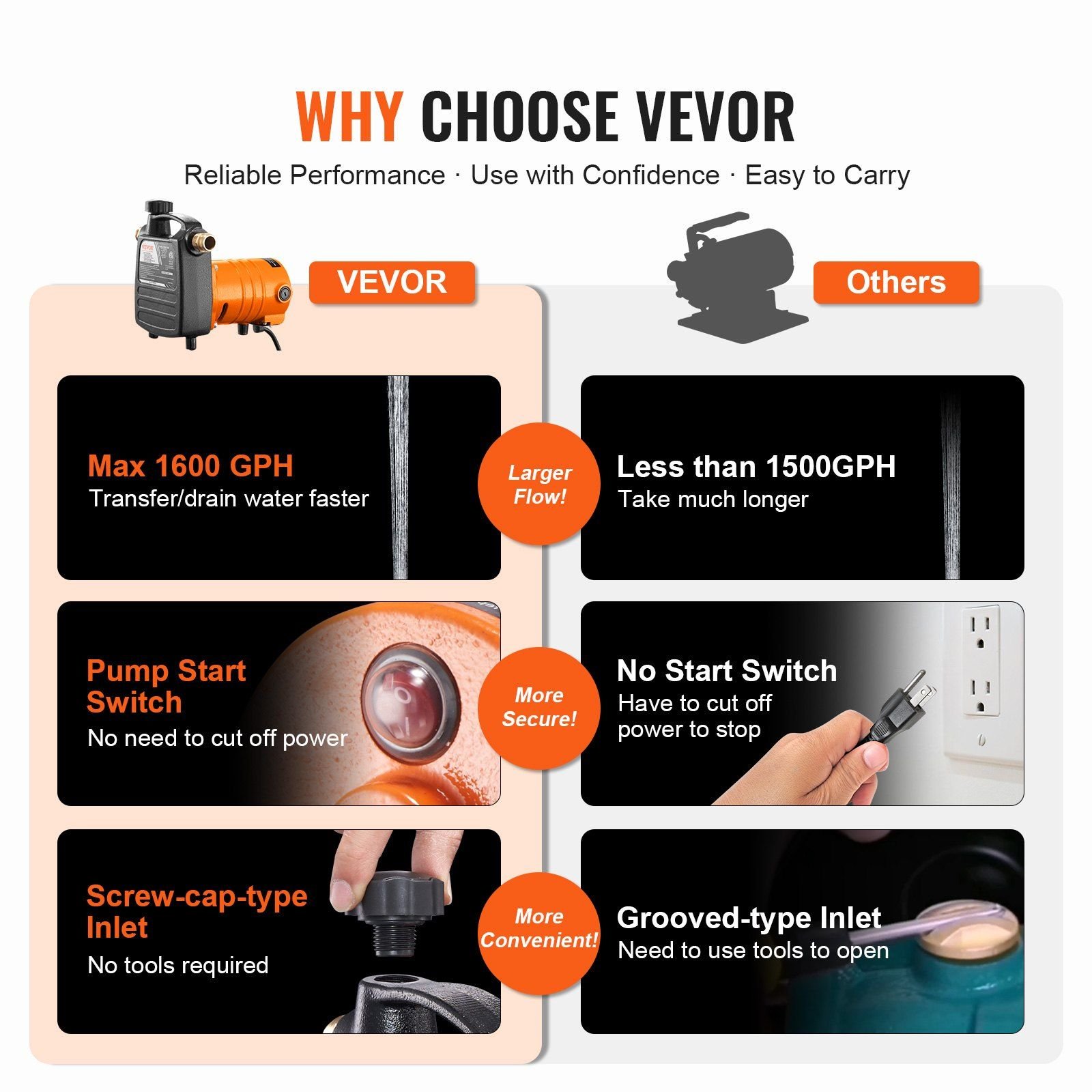 With a powerful 1/2 HP motor, the water transfer utility pump provides a large 1600 GPH flow and 120 ft head lift. No water transfer problem will be a challenge for you.